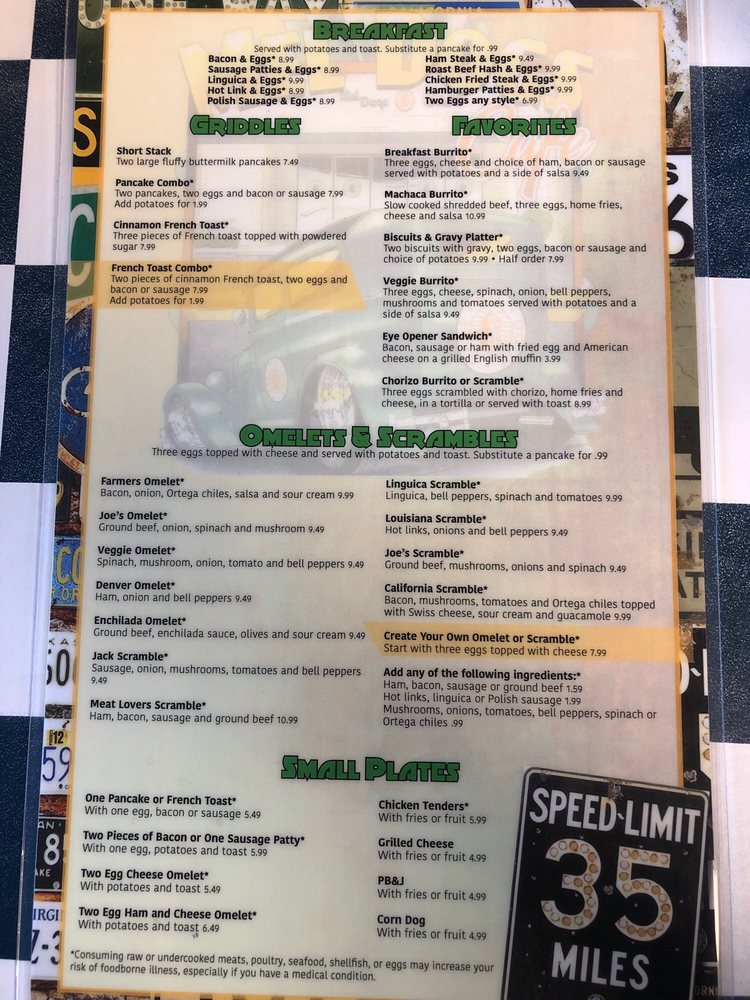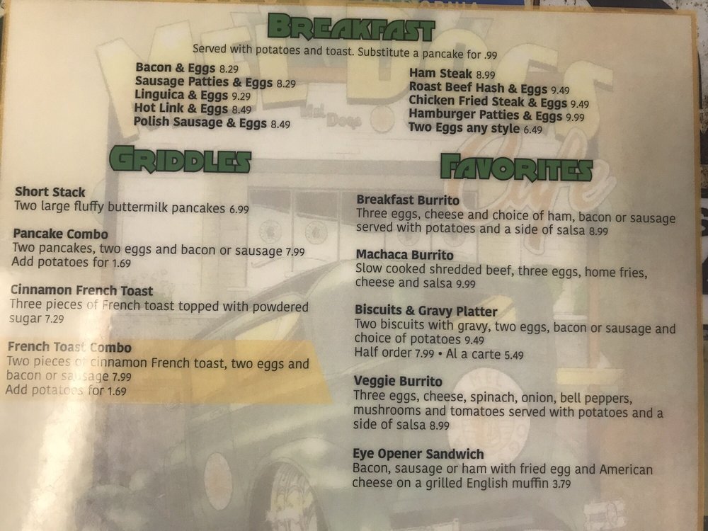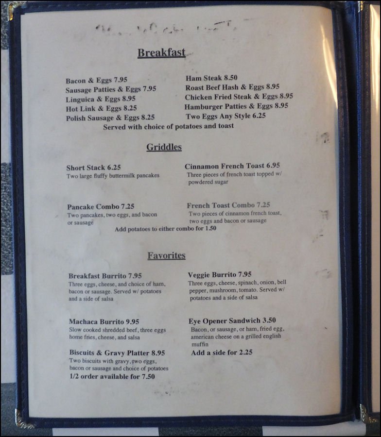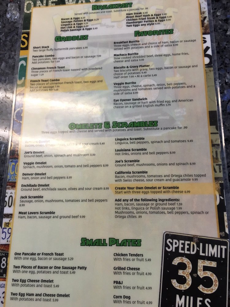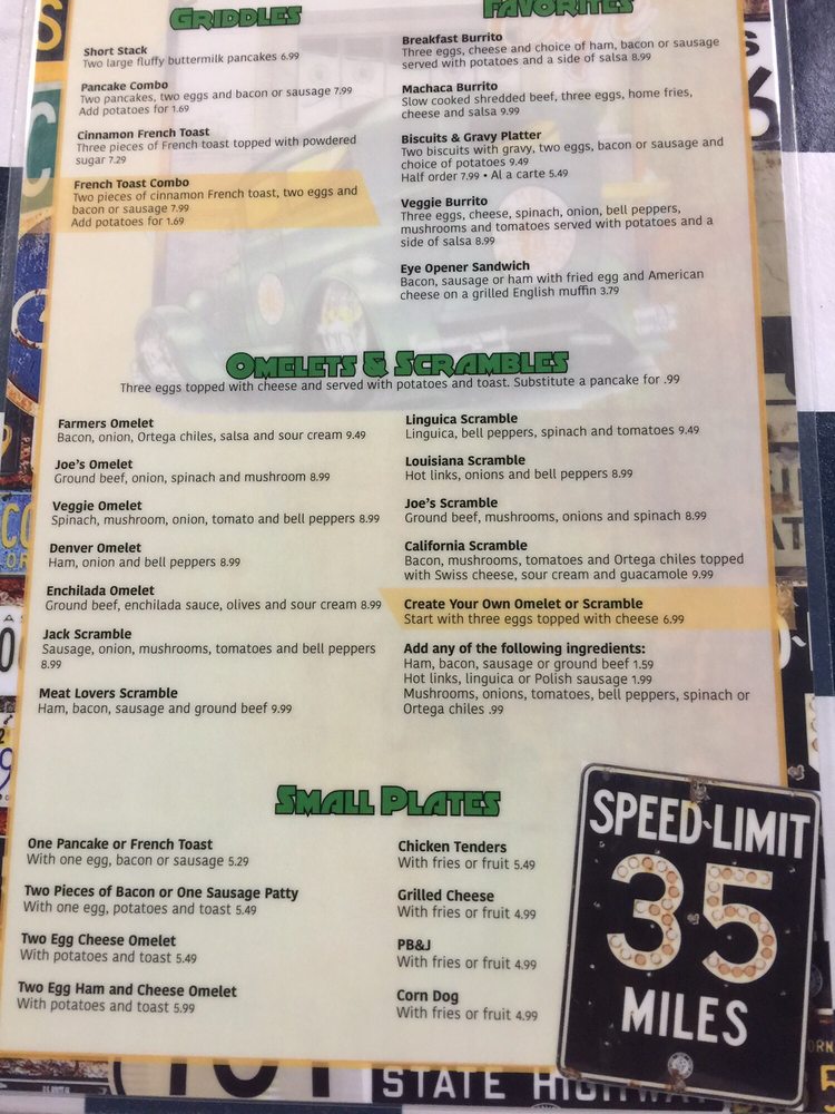 Start with three eggs topped with cheese. Add any off the following ingredients: Ham, bacon, sausage or ground beef - $1.59; Hot links, linguica or Polish sausage - $1.99; Mushrooms, onions, tomatoes, bell peppers, spinach, Ortega chiles - $0.99